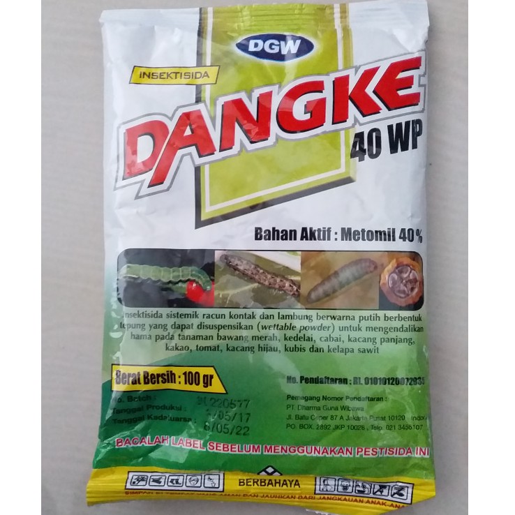 DANGKE 40 WP (umum)metomil : 40 %Insektisida racun kontak dan lambung berbentuk tepung yang dapat disuspensikan.Bawang merah : ulat grayak Spodoptera exigua (Penyemprotan volume tinggi: 3 g/l)Cabai : ulat grayak Spodoptera litura (penyemprotan volume tinggi : 2 g/l)Cabai : hama Helicoverpa armigera (penyemprotan volume tinggi : 1 - 2 g/l)Kacang hijau : penghisap polong Riptortus linearis kepik Nezara viridula lalat bibit Ophiomya phaseoli (Penyemprotan volume tinggi: 2,5 g/l )Kacang hijau : ulat daun Plusia chalcites penggerek polong Etiella zinckenella (Penyemprotan volume tinggi: 2 - 2,5 g/l )Kacang hijau : hama trips Thrips sp. (Penyemprotan volume tinggi : 1,5 - 2 g/l)Kacang hijau : penggulung daun Lamprosema indicata penghisap daun Empoasca sp. (Penyemprotan volume tinggi: 4 g/l )Kacang panjang : penggerek polong Maruca testulalis (Penyemprotan volume tinggi : 2 - 4 g/l)Kacang panjang : kutu daun Aphis craccivora (Penyemprotan volume tinggi : 1,5 - 2 g/l)Kacang panjang : penggerek polong Liriomyza huidobrensis (Penyemprotan volume tinggi : 2 - 2,5 g/l)Kacang tanah : penghisap daun Empoasca sp. (Penyemprotan volume tinggi : 2 - 2,5 g/l)Kakao : hama pengisap buah Helopeltis antonii (Penyemprotan volume tinggi : 1 - 2 g/l)Kedelai : penggerek polong Etiella Zinckenella (Penyemprotan volume tinggi : 1,5 - 3 g/l)Kelapa sawit : ulat kantong Metisa plana, ulat api Setothosea asigna (Penyemprotan volume tinggi : 1 - 2 g/l)Kubis : perusak daun Plutella xylostella, ulat krop Croccidolomia binotalis (Penyemprotan volume tinggi : 1 - 2 g/l)Tomat : hama perusak buah Heliothis armigera (Penyemprotan volume tinggi : 3 - 4
