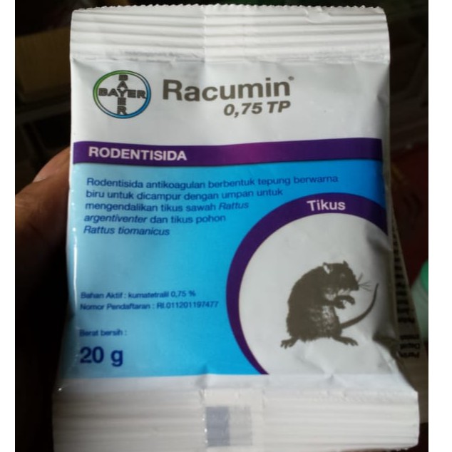 Rodentisida / racun tikus.Bahan aktif : kumatetralil 0,75%.Sangat efektif untuk mengendalikan berbagai spesies tikus.Netto 20gramProduksi