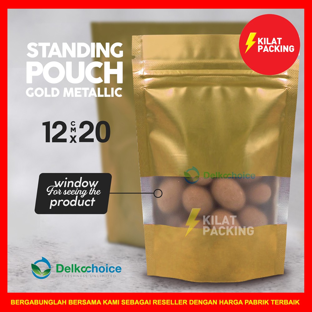 Promo Perlengkapan di Kabupaten Kudus Standing Pouch Gold Metallic / Plastik Gold Metallic Premium Kemasan Makanan Murah 12cm X 20cm dari Delkochoice Kota Jakarta Utara
