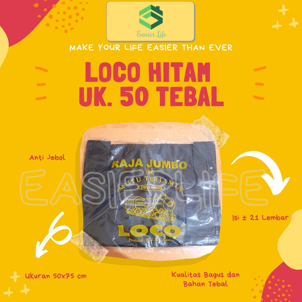 Selamat datang di toko kami.Kami menjual berbagai macam jenis Plastik LOCO lengkap dengan berbagai ukuran.Selamat berbelanja .Kantong LOCO HITAM:Varian dari Kantong Plastik LOCO berwarna Hitam yang TEBAL dan KUAT untuk membawa beban yang berat. Kualitas dari Plastik LOCO ini sudah terjamin BAGUS dan TIDAK BERBAU dibandingkan dengan kantong plastik merek lainnya.Nama Produk: LOCO Hitam TebalMerk: LOCOJenis: Kantong KresekBahan: HDPEWarna: HitamJumlah isi: 1000 gram per pack (+-18 Lembar)Ukuran : 50 x 75 cmToko Buka dari hari Senin - Sabtu jam 08.00 - 15.00SEMUA BARANG READY STOCKLOCO ANTI JEBOL! KUAT BAWA BARANG BERAT!DIJAMIN 100% ORIGINAL LOCOMenerima pembelian secara grosir dan bal""an (silahkan chat untuk alamat toko)Jika ada pertanyaan lebih lanjut bisa langsung menghubungi melalui c